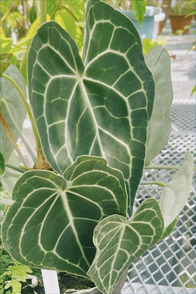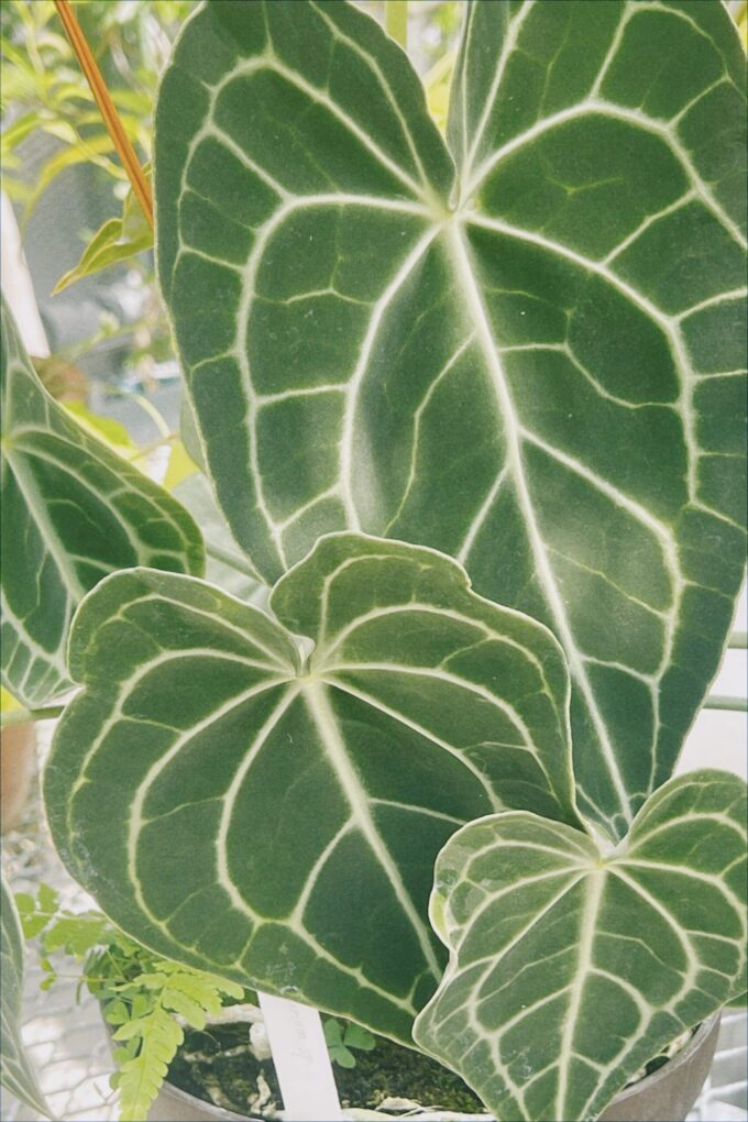クラリネルビウムは、アンスリウムでよくイメージされる真っ赤な花(正確には仏焔苞という部位)ではなく緑色の花を咲かせますが、ハート型の黒々とした葉はベルベットのような質感でその高級感から非常に人気の高い種類です。