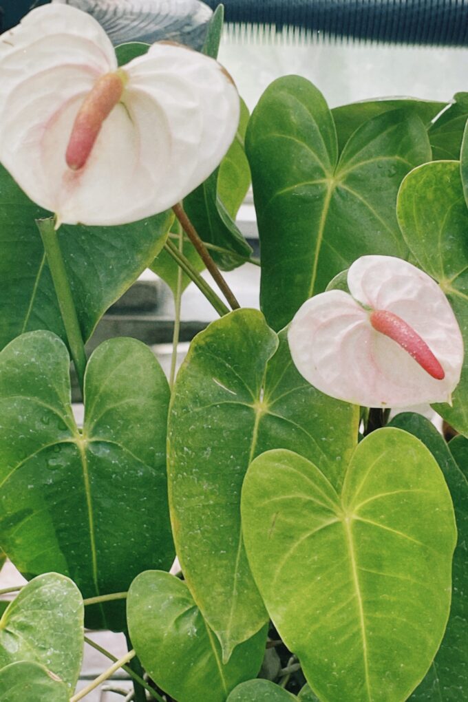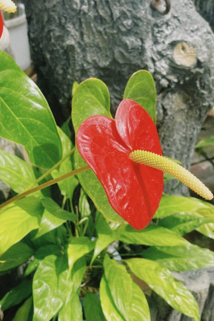 熱帯に生息するサトイモ科の植物であり、赤やピンク色のハート型お皿のような仏炎苞(ぶつえんほう)が特徴的です。これは花ではなく、ここから細い尾のように出てきた黄色い突起が花になります。長期間楽しめる苞を観賞する鉢花として栽培されるほか、観葉植物として楽しむ種類もあります。