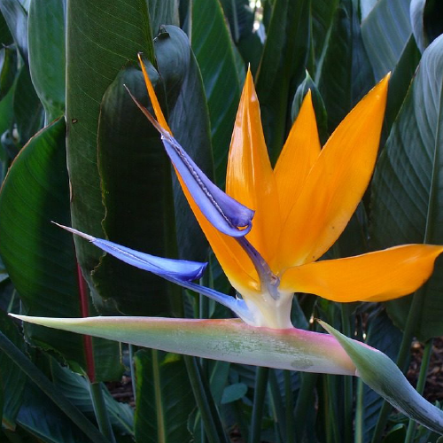 ストレリチアにはオーガスタのような幹が太くとても背が高くなる品種と、レギネのような太い幹のない2mぐらいのややコンパクトな品種があります。花は鮮やかなオレンジ色の萼と青色の花弁からなり、温度を保てば周年開花します。